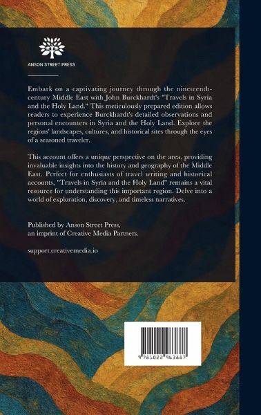 Embark on a captivating journey through the nineteenth-century Middle East with John Burckhardt's "Travels in Syria and the Holy Land." This meticulously prepared edition allows readers to experience Burckhardt's detailed observations and personal encounters in Syria and the Holy Land. Explore the regions' landscapes, cultures, and historical sites through the eyes of a seasoned traveler. This account offers a unique perspective on the area, providing invaluable insights into the history and geography of the Middle East. Perfect for enthusiasts of travel writing and historical accounts, "Travels in Syria and the Holy Land" remains a vital resource for understanding this important region. Delve into a world of exploration, discovery, and timeless narratives. This work has been selected by scholars as being culturally important, and is part of the knowledge base of civilization as we know it. This work is in the public domain in the United States of America, and possibly other nations. Within the United States, you may freely copy and distribute this work, as no entity (individual or corporate) has a copyright on the body of the work. Scholars believe, and we concur, that this work is important enough to be preserved, reproduced, and made generally available to the public. We appreciate your support of the preservation process, and thank you for being an important part of keeping this knowledge alive and relevant.