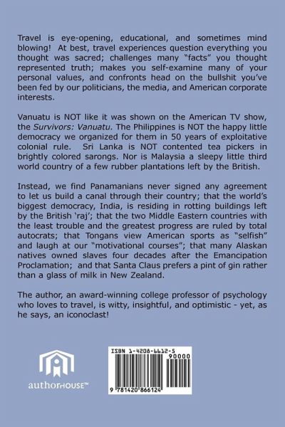 Travel is eye-opening, educational, and sometimes mind blowing! At best, travel experiences question everything you thought was sacred; challenges many "facts" you thought represented truth; makes you self-examine many of your personal values, and confronts head on the bullshit you've been fed by our politicians, the media, and American corporate interests. Vanuatu is NOT like it was shown on the American TV show, the Survivors: Vanuatu. The Philippines is NOT the happy little democracy we organized for them in 50 years of exploitative colonial rule. Sri Lanka is NOT contented tea pickers in brightly colored sarongs. Nor is Malaysia a sleepy little third world country of a few rubber plantations left by the British. Instead, we find Panamanians never signed any agreement to let us build a canal through their country; that the world's biggest democracy, India, is residing in rotting buildings left by the British 'raj'; that the two Middle Eastern countries with the least trouble and the greatest progress are ruled by total autocrats; that Tongans view American sports as "selfish" and laugh at our "motivational courses"; that many Alaskan natives owned slaves four decades after the Emancipation Proclamation; and that Santa Claus prefers a pint of gin rather than a glass of milk in New Zealand. The author, an award-winning college professor of psychology who loves to travel, is witty, insightful, and optimistic - yet, as he says, an iconoclast!