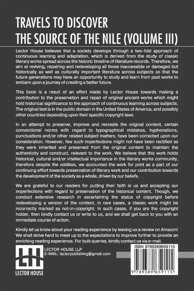 Travels To Discover The Source Of The Nile (Volume III): In The Years 1768, 1769, 1770, 1771, 1772, And 1773. (In Five Volumes, Vol. III.) This book is a result of an effort made by us towards making a contribution to the preservation and repair of original classic literature. In an attempt to preserve, improve and recreate the original content, we have worked towards: 1. Type-setting & Reformatting: The complete work has been re-designed via professional layout, formatting and type-setting tools to re-create the same edition with rich typography, graphics, high quality images, and table elements, giving our readers the feel of holding a 'fresh and newly' reprinted and/or revised edition, as opposed to other scanned & printed (Optical Character Recognition - OCR) reproductions. 2. Correction of imperfections: As the work was re-created from the scratch, therefore, it was vetted to rectify certain conventional norms with regard to typographical mistakes, hyphenations, punctuations, blurred images, missing content/pages, and/or other related subject matters, upon our consideration. Every attempt was made to rectify the imperfections related to omitted constructs in the original edition via other references. However, a few of such imperfections which could not be rectified due to intentional\unintentional omission of content in the original edition, were inherited and preserved from the original work to maintain the authenticity and construct, relevant to the work. We believe that this work holds historical, cultural and/or intellectual importance in the literary works community, therefore despite the oddities, we accounted the work for print as a part of our continuing effort towards preservation of literary work and our contribution towards the development of the society as a whole, driven by our beliefs. We are grateful to our readers for putting their faith in us and accepting our imperfections with regard to preservation of the historical content. HAPPY READING!