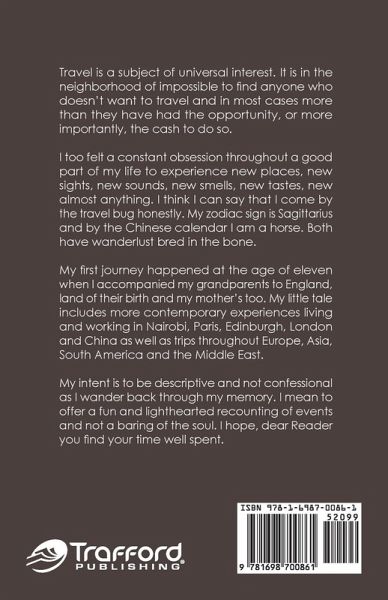 Travel is a subject of universal interest. It is in the neighborhood of impossible to find anyone who doesn't want to travel and in most cases more than they have had the opportunity, or more importantly, the cash to do so. I too felt a constant obsession throughout a good part of my life to experience new places, new sights, new sounds, new smells, new tastes, new almost anything. I think I can say that I come by the travel bug honestly. My zodiac sign is Sagittarius and by the Chinese calendar I am a horse. Both have wanderlust bred in the bone. My first journey happened at the age of eleven when I accompanied my grandparents to England, land of their birth and my mother's too. My little tale includes more contemporary experiences living and working in Nairobi, Paris, Edinburgh, London and China as well as trips throughout Europe, Asia, South America and the Middle East. My intent is to be descriptive and not confessional as I wander back through my memory. I mean to offer a fun and lighthearted recounting of events and not a baring of the soul. I hope, dear Reader you find your time well spent.