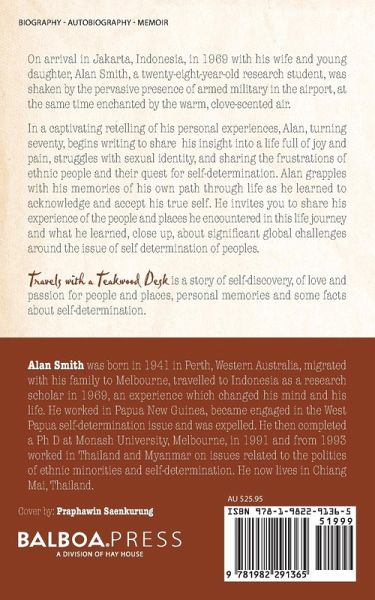 On arrival in Jakarta, Indonesia, in 1969 with his wife and young daughter, Alan Smith, a twenty-eight-year-old research student, was shaken by the pervasive presence of armed military in the airport, at the same time enchanted by the warm, clove-scented air. In a captivating retelling of his personal experiences, Alan, turning seventy, begins writing to share his insight into a life full of joy and pain, struggles with sexual identity, and sharing the frustrations of ethnic people and their quest for self-determination. Alan grapples with his memories of his own path through life as he learned to acknowledge and accept his true self. He invites you to share his experience of the people and places he encountered in this life journey and what he learned, close up, about significant global challenges around the issue of self determination of peoples. Travels with a Teakwood Desk is a story of self-discovery, of love and passion for people and places, personal memories and some facts about self-determination.
