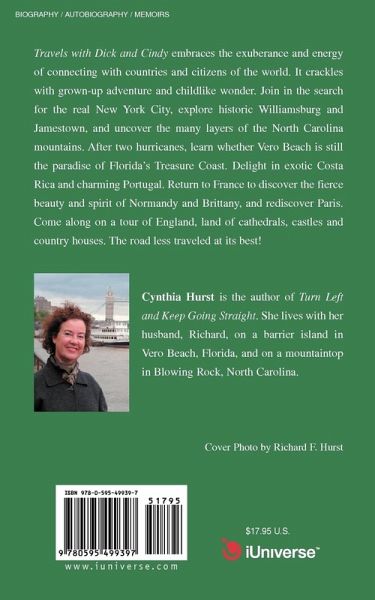 Travels with Dick and Cindy embraces the exuberance and energy of connecting with countries and citizens of the world. It crackles with grown-up adventure and childlike wonder. Join in the search for the real New York City, explore historic Williamsburg and Jamestown, and uncover the many layers of the North Carolina mountains. After two hurricanes, learn whether Vero Beach is still the paradise of Florida's Treasure Coast. Delight in exotic Costa Rica and charming Portugal. Return to France to discover the fierce beauty and spirit of Normandy and Brittany, and rediscover Paris. Come along on a tour of England, land of cathedrals, castles and country houses. The road less traveled at its best!
