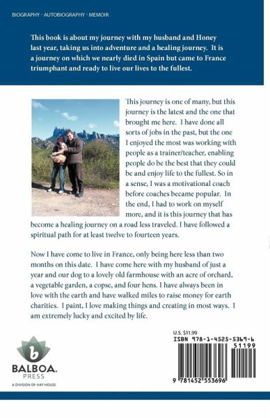 This book is about my journey with my husband and Honey last year, taking us into adventure and a healing journey. It is a journey on which we nearly died in Spain but came to France triumphant and ready to live our lives to the fullest. This journey is one of many, but this journey is the latest and the one that brought me here. I have done all sorts of jobs in the past, but the one I enjoyed the most was working with people as a rainer/teacher, enabling people do be the best that they could be and enjoy life to the fullest. So in a sense, I was a motivational coach before coaches became popular. In the end, I had to work on myself more, and it is this journey that has become a healing journey on a road less traveled. I have followed a spiritual path for at least twelve to fourteen years. Now I have come to live in France, only being here less than two months on this date. I have come here with my husband of just a year and our dog to a lovely old farmhouse with an acre of orchard, a vegetable garden, a copse, and four hens. I have always been in love with the earth and have walked miles to raise money for earth charities. I paint, I love making things and creating in most ways. I am extremely lucky and excited by life.
