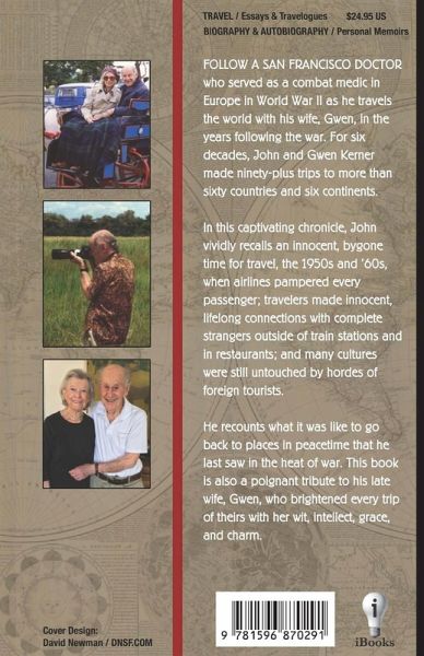 Follow a San Francisco doctor who served as a combat medic in Europe in World War II as he travels the world with his wife, Gwen, in the years following the war. For six decades, John and Gwen Kerner made ninety-plus trips to more than sixty countries and six continents. In this captivating chronicle, John vividly recalls an innocent, bygone time for travel, the 1950s and '60s when airlines pampered every passenger; travelers made innocent, lifelong connections with complete strangers outside of train stations and in restaurants; and many cultures were still untouched by hordes of foreign tourists. He recounts what it was like to go back to places in peacetime that he last saw in the heat of war. This book is also a poignant tribute to his late wife, Gwen, who brightened every trip of theirs with her wit, intellect, grace, and charm.