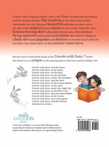Imagine if our pets could travel the world with us. What adventures would they have? What trouble would they get into? What friends would they make? In the award-winning Travels with Zozo... series of illustrated children's books for ages 4-8 years old, a fun-loving family of four brings their pet bunny, Zozo, on their trips around the world, and Zozo's escapades are bound to amaze, amuse, and inspire you! Author A.J. Atlas' extensive travel experiences in nearly fifty countries and throughout all fifty U.S. states provide firsthand insight into the settings for the books. Award-winning illustrator Anne Zimanski uses bright colors and expert digital artistry to turn the real-life places into beautifully colorful, imaginative worlds for Zozo and readers to explore. She adds an abundance of charm and heart to the culturally-diverse characters whom Zozo meets, and she packs Zozo's sweet, little, furry face full of emotion. Then, together, Atlas and Zimanski keep the pages filled with goofy gags and funny antics. So many, in fact, that rereading the stories is sure to surprise you with something new and keep you laughing. The sixth book in the exciting, new series, Travels with Zozo...and the Deer, takes readers to meet the famous bowing deer of Japan. Zozo and her human family learn to greet these friendly creatures and benefit from their willingness to help Zozo when she loses her beloved necklace. ¿ The search takes Zozo through the pine forests and picturesque ponds of Nara Park and past ancient architectural wonders like the Great Eastern Temple (Todai-ji) with its huge bronze status of Buddha, the beautiful Kasuga Grand Shrine, and the famous five-tiered pagoda of the Kufuki-ji Temple complex. Zozo and her new friends are joined by whimsically illustrated locals-acrobatic tanuki, board-breaking birds, leaping frogs, and many others. The wildlife adds depth and richness (and laughs!) to the ancient town of Nara showcased in this premium full-color 32-page book. Children and grownups alike are sure to fall in love with the "hoppity, floppity, huggable, snuggable" pet bunny, Zozo, in this beautifully-illustrated, pint-sized Japanese travel log. They will be amazed by the detailed illustrations of actual plants, animals, and landscapes of Japan while laughing at the goofy goings-on in every corner of the pages. Bring your imagination and let Zozo be your guide to a world of amazing places!