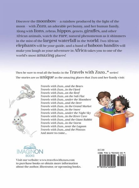 Imagine if our pets could travel the world with us. What adventures would they have? What trouble would they get into? What friends would they make? In the award-winning Travels with Zozo... series of illustrated children's books for ages 4-8 years old, a fun-loving family of four brings their pet bunny, Zozo, on their trips around the world, and Zozo's escapades are bound to amaze, amuse, and inspire you! Author A.J. Atlas' extensive travel experiences in nearly fifty countries and throughout all fifty U.S. states provide firsthand insight into the settings for the books. Award-winning illustrator Anne Zimanski uses bright colors and expert digital artistry to turn the real-life places into beautifully colorful, imaginative worlds for Zozo and readers to explore. She adds an abundance of charm and heart to the culturally-diverse characters whom Zozo meets, and she packs Zozo's sweet, little, furry face full of emotion. Then, together, Atlas and Zimanski keep the pages filled with goofy gags and funny antics. So many, in fact, that rereading the stories is sure to surprise you with something new and keep you laughing. The fifth book in the exciting, new series, Travels with Zozo...under the Moonbow, takes readers to the world's largest waterfall, located on the border of Zambia and Zimbabwe. Zozo and her human family are on vacation there to experience the African natural wonder and all that surrounds it. The fun begins with a hike along the waterfall's winding pathways. As Zozo and her family splash in the puddles and spy the rainbows created by the waterfall, another fun-loving but furry family looks on with plans for a good-natured game of their own. Before long, in a hilarious scene of puddle-filled fun, the baboon bandits pickpocket Zozo's family! ¿ Luckily, two helpful African elephants are nearby to offer help to Zozo, inviting her to a wide clearing where the mischievous monkeys stash their lifted loot. The flat cliffside expanse also is the place where zebras, giraffe, warthogs, baboons, hippos, and others gather to watch the rare and beautiful moonbow-a rainbow produced by the light of the moon. All during the adventure, Zozo and her friends are joined by whimsically illustrated locals-toothbrushing hippos, soccer-playing zebras, and many others. The wildlife adds depth and richness (and laughs!) to the majestic African waterfall showcased in this premium full-color 32-page book. Children and grownups alike are sure to fall in love with the "hoppity, floppity, huggable, snuggable" pet bunny, Zozo, in this beautifully-illustrated, pint-sized African travel log. They will be amazed by the detailed illustrations of actual plants, animals, and landscapes of Zambia and Zimbabwe while laughing at the goofy goings-on in every corner of the pages. Bring your imagination and let Zozo be your guide to a world of amazing places!