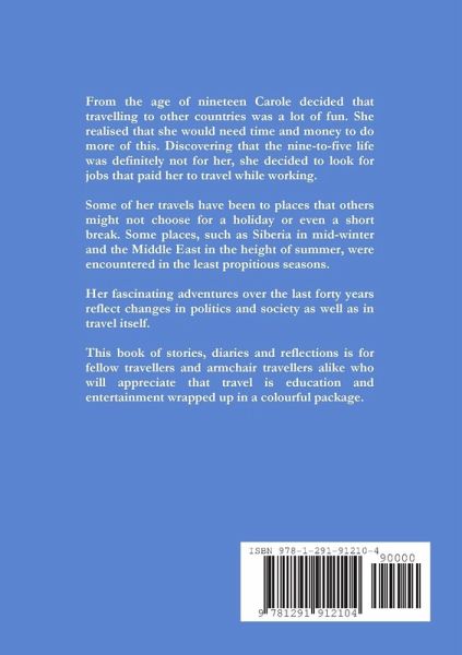 From the age of nineteen Carole decided that travelling to other countries was a lot of fun. She realised that she would need time and money to do more of this. Discovering that the nine-to-five life was definitely not for her, she decided to look for jobs that paid her to travel while working. Some of her travels have been to places that others might not choose for a holiday or even a short break. Some places, such as Siberia in mid-winter and the Middle East in the height of summer, were encountered in the least propitious seasons. Her fascinating adventures over the last forty years reflect changes in politics and society as well as in travel itself. This book of stories, diaries and reflections is for fellow travellers and armchair travellers alike who will appreciate that travel is education and entertainment wrapped up in a colourful package.