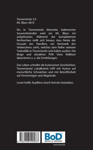 Ein in Travemünde lebender, italienischer Souvenirhändler wird am Mt. Blanc tot aufgefunden. Während der komplizierten Recherchen stellt sich heraus, dass hinter der Fassade des Händlers, ein Netzwerk des Verbrechens steht, welches eine Reihe weiterer Todesfälle in Travemünde und Italien auslöst. Die kluge und attraktive POK Stina Wallison übernimmt u. a. die Ermittlungen.Das Leben schreibt die kuriosesten Geschichten. Travemünder Lokalkolorit trifft mit Humor auf menschliche Schwächen und mit Betroffenheit auf Unvermögen und Abgründe. Lesen heißt: Kopfkino durch fremde Gedanken.