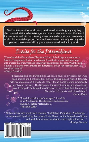 Sucked into another world and transformed into a frog, a young boy discovers what it is to be a stranger - a parepidimos - in a land that is not his own. He is stripped of his own identity and given a new name, Puddlehop. Determinedly, he seeks to find his way home, remove his stain, and survive in a world of constant danger, surprise, and wonder - ultimately leading to his greatest discovery of all: by grace we are saved, and not by works. In Traversing Truth: Book 1 of the Parepidimos Series, Puddlehop, who is outwardly stained by the actions that brought him to the land of Icholexia, encounters the greatest enemy of all, Spyridon, whose "stained-ones" are his. Pursued by Spyridon, Puddlehop must confront his actions, beliefs, and fears as he seeks to find a way home and rid himself of his stain. ¿ In the strange world of Icholexia, where nothing seems "normal" and travel from one country to the next is done through puddles, Puddlehop is joined by his brother, Liamleap, and his new faithful friend, Raya Sunshine. As trio embark on an adventure beyond their wildest dreams, they must each ask the question: What is truth? This book is truly a book for ALL AGES!!! Join them on their adventure today!