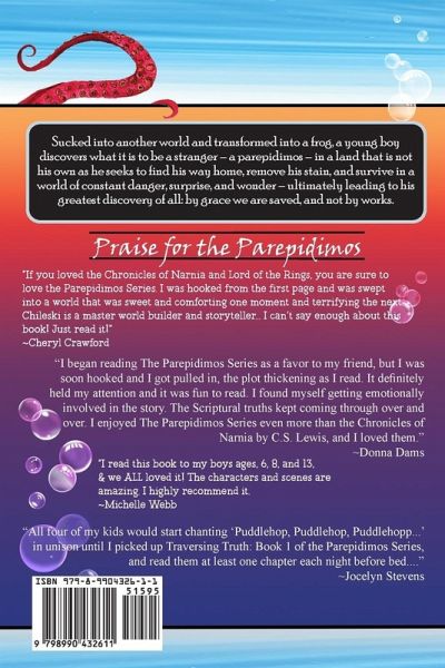 Sucked into another world and transformed into a frog, a young boy discovers what it is to be a stranger - a parepidimos - in a land that is not his own. He is stripped of his own identity and given a new name, Puddlehop. Determinedly, he seeks to find his way home, remove his stain, and survive in a world of constant danger, surprise, and wonder - ultimately leading to his greatest discovery of all: by grace we are saved, and not by works. In Traversing Truth: Book 1 of the Parepidimos Series, Puddlehop, who is outwardly stained by the actions that brought him to the land of Icholexia, encounters the greatest enemy of all, Spyridon, whose "stained-ones" are his. Pursued by Spyridon, Puddlehop must confront his actions, beliefs, and fears as he seeks to find a way home and rid himself of his stain. ¿ In the strange world of Icholexia, where nothing seems "normal" and travel from one country to the next is done through puddles, Puddlehop is joined by his brother, Liamleap, and his new faithful friend, Raya Sunshine. As trio embark on an adventure beyond their wildest dreams, they must each ask the question: What is truth? This book is truly a book for ALL AGES!!! Join them on their adventure today!