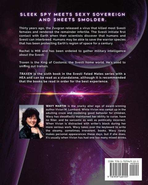 Sleek spy meets sexy sovereign and sheets smolder. Thirty years ago, the Zuvgran released a virus that killed most Svesti females and rendered the remainder infertile. The Svesti initiate first contact with Earth when their scientists discover that humans and Svesti can interbreed. Humans may be able to save the warrior species that has been protecting Earth's region of space for a century. Rachel is MI6 and has been ordered to gather military intelligence about the Svesti. Traxen is the King of Costonia, the Svesti home world. He's used to sniffing out traitors. Traxen is the sixth book in the Svesti Fated Mates series with a HEA and can be read as a standalone, although it is recommended that the books be read in order for the best experience.