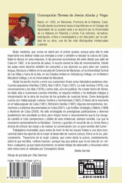Concepción Teresa de Jesús Alzola y Vega, nació en 1930 en Marianao, Provincia de La Habana, Cuba. Falleció exiliada en Miami en 2009. Estudió del primario al bachillerato en el Colegio del Apostolado en La Habana y obtuvo un doctorado en Filosofía y Letras en la Universidad de La Habana. Destacó como teatrista, narradora, lexicógrafa, crítica e investigadora, siendo una de las intelectuales cubanas más distinguidas. Aleida Garrido la describió como una mujer modesta que priorizaba dedicar sus energías a crear y preservar la cultura cubana. Nada la detuvo, ni las penurias del exilio desde 1962, ni la salud precaria, ni la falta de reconocimiento. Como docente, transmitió su amor por el idioma y folklore en la Escuela de Comercio de Marianao, la Universidad Central de Las Villas y en EE. UU. en Gettysburg College, Western Maryland College y la Universidad de Maryland. A pesar de honores, mantuvo su trato afable, conocida como Concha, directa y humorística. Presidió la Asociación de Hispanistas de las Américas. Entre sus libros están Cuentos populares infantiles (1955), Noé (1957), Firpo (1957), La más fermosa (1975) y Las conversaciones y los días (1979). Como lexicógrafa abordó habla popular cubana, léxico marino, refranes, extranjerismos en Cuba, Las Antillas y Nombres de Cuba. Analizó el papel de la mujer cubana desde la colonia, incluyendo patriotas, educadoras, autoras, músicas, científicas, periodistas y deportistas. Su obra es esencial para comprender la historia cubana, destacando su reedición póstuma en 2009. Teresa Fernández Soneira también exploró la contribución de las mujeres cubanas en MUJERES DE LA PATRIA (Ediciones Universal). Archivos de Concha Alzola están en la Cuban Heritage Collection de la Universidad de Miami. El dibujo en la cubierta es de Zilia Sánchez.
