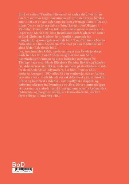 Bind 4 i serien "Families Historier" er anden del af historien om min mormor Inger Rasmussen gift Christensen og hendes aner, som der er stor viden om, og som går meget langt tilbage i tiden. Det er en fortsættelse af bind 3 med titlen"Slægten i Vindeby". Dette bind har fokus på hendes mormor mors aner. Inger mor, Marie Christine Rasmussen født Madsen var datter af Carl Christian Madsen, hvis familie stammede fra Langeland, og som også er omtalt bind 3, og Christiana Maren Sofie Madsen født Andersen, hvis aner på den mødrende side altså fylder hele fjerde bind. Ina, som hun blev kaldt, havde en meget stor kendt forslægt. Både hendes far, Poul Andersen og mormor Ane Sofie Rasmusdatter Frantzen og deres forfædre stammede fra Tåsinge. Inas mor, Marie Elisabeth Kirstine Bekker og hendes far, Adrian Severin Bekker, nedstammede på den fædrende side fra de nederlandske indvandrere, der blev inviteret til at opdyrke Amager i 1500-tallet.På den mødrende side er Adrian Severins aner at finde blandt det såkaldte fynske rådsaristokrati - først og fremmest i Odense - samt sydfynske skipper- og købmandsslægter fra Svendborg og Ærø. Disse stammede igen via præster og embedsmænd i hertugdømmerne fra købmands-, rådmands- og borgmesterslægter i Hansestæderne, der kan føres tilbage til omkring 1100.