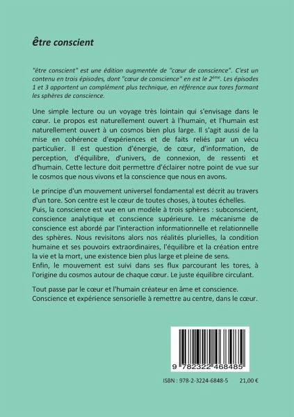 "être conscient" est une édition augmentée de "coeur de conscience". C'est un contenu en trois épisodes, dont "coeur de conscience" en est le 2ème. Les épisodes 1 et 3 apportent un complément plus technique, en référence aux tores formant les sphères de conscience.Une simple lecture ou un voyage très lointain qui s'envisage dans le coeur. Le propos est naturellement ouvert à l'humain, et l'humain est naturellement ouvert à un cosmos bien plus large. Il est question d'énergie, de coeur, d'information, de perception, d'équilibre, d'univers, de connexion, de ressenti et d'humain. Une lecture destinée à éclairer notre point de vue sur le cosmos que nous vivons et la conscience que nous en avons.Le principe d'un mouvement universel fondamental est décrit au travers d'un tore. Son centre est le coeur de toutes choses.Puis, le mécanisme de conscience est abordé par l'interaction informationnelle et relationnelle de trois sphères : Subconscient ; Conscience analytique ; Conscience supérieure. Nous revisitons alors nos réalités plurielles, la condition humaine et ses pouvoirs extraordinaires, l'équilibre et la création entre la vie et la mort, une existence bien plus large et pleine de sens.Enfin, le mouvement est suivi dans ses flux parcourant les tores, à l'origine du cosmos autour de chaque coeur. Le juste équilibre circulant.Tout passe par le coeur et l'humain créateur en âme et conscience.Conscience et expériences sensorielles recentrées dans le coeur.