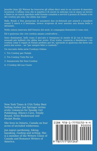 Jennifer Jane (JJ) Watson ha trascorso gli ultimi dieci anni in un carcere di massima sicurezza. L'ultima cosa che si aspetta è di uscire in anticipo con in mano un lavoro e finire in un ranch sperduto nelle foreste canadesi a servire il pranzo di Natale a tre dei cowboy più sexy che abbia mai visto! Rafe, Brady e Dan pensavano di assumere due ex-detenuti per aiutarli a mandare avanti il ranch e il bestiame, invece scoprono di aver assunto una donna bella e attraente. Nella natura innevata dell'Ontario del nord, la compagnia femminile è cosa rara. Ed è qualcosa che i tre cowboy amano condividere... Sono dominatori, belli come il peccato e riempiono la mente di JJ con le fantasie sessuali più bollenti che abbia mai avuto. D'un tratto, comincia a desiderare i tre cowboy come il regalo di Natale perfetto per lei, sperando in qualcosa che forse non potrà mai avere... un "per sempre felici e contenti." Un racconto della serie Cowboys Online: 1. Tre Cowboy per Natale 2. Tre Cowboy Tutti Per Lei 3. Innamorata Dei Suoi Cowboy 4. I Cowboy del suo Cuore