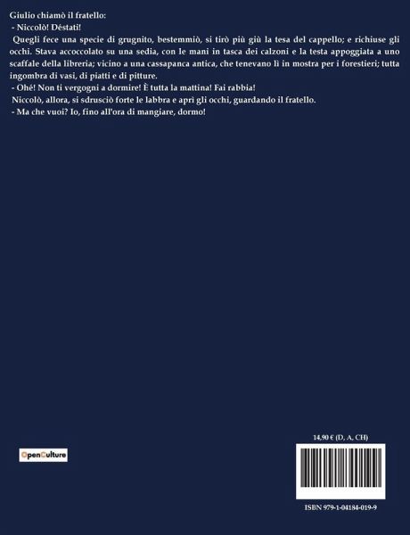 Giulio chiamò il fratello: - Niccolò! Déstati! Quegli fece una specie di grugnito, bestemmiò, si tirò più giù la tesa del cappello; e richiuse gli occhi. Stava accoccolato su una sedia, con le mani in tasca dei calzoni e la testa appoggiata a uno scaffale della libreria; vicino a una cassapanca antica, che tenevano lì in mostra per i forestieri; tutta ingombra di vasi, di piatti e di pitture. - Ohé! Non ti vergogni a dormire! È tutta la mattina! Fai rabbia! Niccolò, allora, si sdrusciò forte le labbra e aprì gli occhi, guardando il fratello. - Ma che vuoi? Io, fino all'ora di mangiare, dormo!