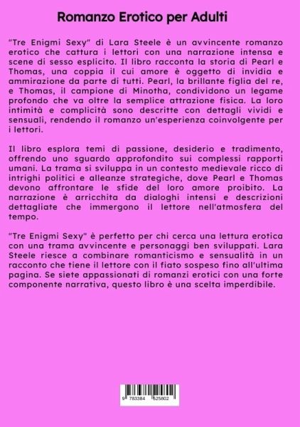 "Tre Enigmi Sexy" di Lara Steele è un avvincente romanzo erotico che cattura i lettori con una narrazione intensa e scene di sesso esplicito. Il libro racconta la storia di Pearl e Thomas, una coppia il cui amore è oggetto di invidia e ammirazione da parte di tutti. Pearl, la brillante figlia del re, e Thomas, il campione di Minotha, condividono un legame profondo che va oltre la semplice attrazione fisica. La loro intimità e complicità sono descritte con dettagli vividi e sensuali, rendendo il romanzo un'esperienza coinvolgente per i lettori.Il libro esplora temi di passione, desiderio e tradimento, offrendo uno sguardo approfondito sui complessi rapporti umani. La trama si sviluppa in un contesto medievale ricco di intrighi politici e alleanze strategiche, dove Pearl e Thomas devono affrontare le sfide del loro amore proibito. La narrazione è arricchita da dialoghi intensi e descrizioni dettagliate che immergono il lettore nell'atmosfera del tempo."Tre Enigmi Sexy" è perfetto per chi cerca una lettura erotica con una trama avvincente e personaggi ben sviluppati. Lara Steele riesce a combinare romanticismo e sensualità in un racconto che tiene il lettore con il fiato sospeso fino all'ultima pagina. Se siete appassionati di romanzi erotici con una forte componente narrativa, questo libro è una scelta imperdibile.
