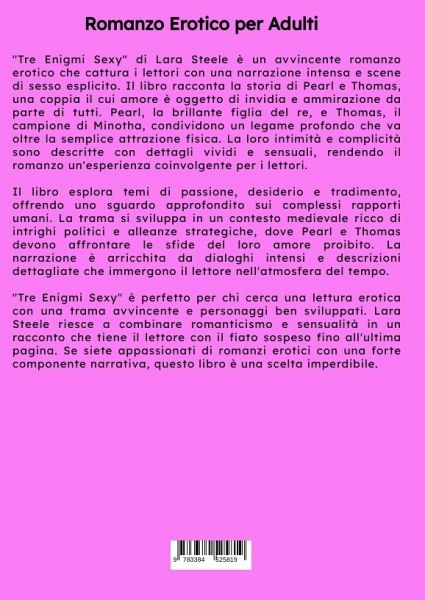 "Tre Enigmi Sexy" di Lara Steele è un avvincente romanzo erotico che cattura i lettori con una narrazione intensa e scene di sesso esplicito. Il libro racconta la storia di Pearl e Thomas, una coppia il cui amore è oggetto di invidia e ammirazione da parte di tutti. Pearl, la brillante figlia del re, e Thomas, il campione di Minotha, condividono un legame profondo che va oltre la semplice attrazione fisica. La loro intimità e complicità sono descritte con dettagli vividi e sensuali, rendendo il romanzo un'esperienza coinvolgente per i lettori.Il libro esplora temi di passione, desiderio e tradimento, offrendo uno sguardo approfondito sui complessi rapporti umani. La trama si sviluppa in un contesto medievale ricco di intrighi politici e alleanze strategiche, dove Pearl e Thomas devono affrontare le sfide del loro amore proibito. La narrazione è arricchita da dialoghi intensi e descrizioni dettagliate che immergono il lettore nell'atmosfera del tempo."Tre Enigmi Sexy" è perfetto per chi cerca una lettura erotica con una trama avvincente e personaggi ben sviluppati. Lara Steele riesce a combinare romanticismo e sensualità in un racconto che tiene il lettore con il fiato sospeso fino all'ultima pagina. Se siete appassionati di romanzi erotici con una forte componente narrativa, questo libro è una scelta imperdibile.