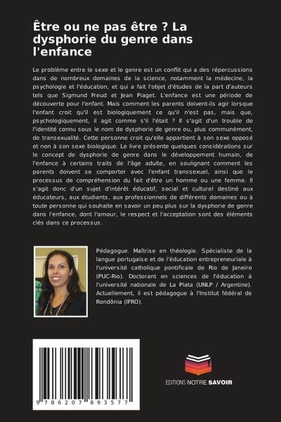 Le problème entre le sexe et le genre est un conflit qui a des répercussions dans de nombreux domaines de la science, notamment la médecine, la psychologie et l'éducation, et qui a fait l'objet d'études de la part d'auteurs tels que Sigmund Freud et Jean Piaget. L'enfance est une période de découverte pour l'enfant. Mais comment les parents doivent-ils agir lorsque l'enfant croit qu'il est biologiquement ce qu'il n'est pas, mais que, psychologiquement, il agit comme s'il l'était ? Il s'agit d'un trouble de l'identité connu sous le nom de dysphorie de genre ou, plus communément, de transexualité. Cette personne croit qu'elle appartient à son sexe opposé et non à son sexe biologique. Le livre présente quelques considérations sur le concept de dysphorie de genre dans le développement humain, de l'enfance à certains traits de l'âge adulte, en soulignant comment les parents doivent se comporter avec l'enfant transsexuel, ainsi que le processus de compréhension du fait d'être un homme ou une femme. Il s'agit donc d'un sujet d'intérêt éducatif, social et culturel destiné aux éducateurs, aux étudiants, aux professionnels de différents domaines ou à toute personne qui souhaite en savoir un peu plus sur la dysphorie de genre dans l'enfance, dont l'amour, le respect et l'acceptation sont des éléments clés dans ce processus.