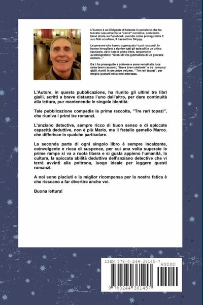 L'Autore, in questa pubblicazione, ha riunito gli ultimi tre libri gialli: "Assassinio al Kirribilli Club", "Assassinio sul Pride of Africa" e "Assassinio alla Bombonera". Tale volume si compendia con "Tre rari topazi", che contiene invece i primi tre romanzi gialli che avevano come detective il fratello Mario. L'anziano detective degli ultimi romanzi è invece il gemello Marco, che ha le stesse spiccate capacità deduttive del fratello, anche se si differenzia in qualche piccolo particolare. Ciascun libro è sempre incalzante, coinvolgente e ricco di suspence, per cui una volta superate le prime rampe si va a ruota libera e si gusta appieno l'umanità, la cultura, la spiccata abilità deduttiva dell'anziano detective che vi terrà avvinti alla poltrona, luogo ideale per leggere questi romanzi. A noi sono piaciuti e la miglior ricompensa per la nostra fatica è che riescano a far divertire anche voi.