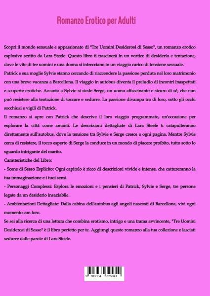 Scopri il mondo sensuale e appassionato di "Tre Uomini Desiderosi di Sesso", un romanzo erotico esplosivo scritto da Lara Steele. Questo libro ti trascinerà in un vortice di desiderio e tentazione, dove le vite di tre uomini e una donna si intrecciano in un viaggio carico di tensione sessuale.Patrick e sua moglie Sylvie stanno cercando di riaccendere la passione perduta nel loro matrimonio con una breve vacanza a Barcellona. Il viaggio in autobus diventa il preludio di incontri inaspettati e scoperte erotiche. Accanto a Sylvie si siede Serge, un uomo affascinante e sicuro di sé, che non può resistere alla tentazione di toccare e sedurre. La passione divampa tra di loro, sotto gli occhi socchiusi e vigili di Patrick.Il romanzo si apre con Patrick che descrive il loro viaggio programmato, un'occasione per esplorare la città come amanti. Le descrizioni dettagliate di Lara Steele ti catapulteranno direttamente sull'autobus, dove la tensione tra Sylvie e Serge cresce a ogni pagina. Mentre Sylvie cerca di resistere, il tocco esperto di Serge la conduce in un mondo di piacere proibito, tutto sotto lo sguardo intrigante del marito.Caratteristiche del Libro:- Scene di Sesso Esplicito: Ogni capitolo è ricco di descrizioni vivide e intense, che cattureranno la tua immaginazione e i tuoi sensi.- Personaggi Complessi: Esplora le emozioni e i pensieri di Patrick, Sylvie e Serge, tre persone legate da un desiderio insaziabile.- Ambientazioni Dettagliate: Dalla cabina dell'autobus agli angoli nascosti di Barcellona, vivi ogni momento con loro.Se sei alla ricerca di una lettura che combina erotismo, intrigo e una trama avvincente, "Tre Uomini Desiderosi di Sesso" è il libro perfetto per te. Aggiungi questo romanzo alla tua collezione e lasciati sedurre dalle parole di Lara Steele.