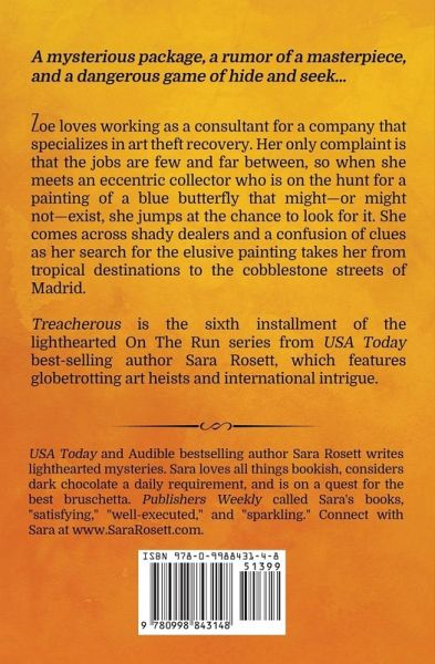 A mysterious package, a rumor about a missing painting, and a dangerous game of hide and seek… Zoe loves working as a consultant for a company that specializes in the recovery of stolen art. Her only complaint is that the jobs are few and far between, so when she meets an eccentric collector who is on the hunt for a painting of a blue butterfly that might—or might not—exist, she jumps at the chance to look for it. She comes across shady dealers and a confusion of clues as her search for the elusive painting takes her from tropical destinations to the cobblestone streets of Madrid. Treacherous is the sixth installment of the lighthearted On The Run series from USA Today best-selling author Sara Rosett, which features globetrotting art heists and international intrigue.