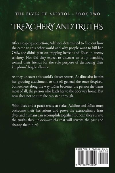 After searching for a way home, is the comfort of her past worth giving up the love she sees in her future? After escaping abduction, Adaline's determined to find answers about how she came to this other world and why people want to kill her. Now she and Ëólas find themselves deep in enemy territory, and they must work together to escape in time to save their people. As they uncover more of this world's darker secrets, Adaline and Ëólas are the only ones who can warn their friends of the army marching to destroy their kingdoms' fragile alliance. Adaline also battles her growing attachment to the elf general she once hated. Somewhere along the way, Ëólas becomes the person she trusts most of all, the person who leads her to the doorway home. Only now, Adaline's not so sure she can step through. With lives and a peace treaty at stake, Adaline and Ëólas must overcome their hesitations and prove the extraordinary feats elves and humans can accomplish together. But can they survive the truths they unlock that will rewrite the past and change the future? Featuring a strong female heroine and a ruminating elf, Treachery and Truths is ideal for readers looking for forced proximity, friends to lovers, fae magic, faerie lore, and a hidden destiny. As the second book of The Aerytol Saga, this spicy story blends fantasy, adventure, and romance into a breathtaking read. This series must be read sequentially, and book two begins a guaranteed HEA.