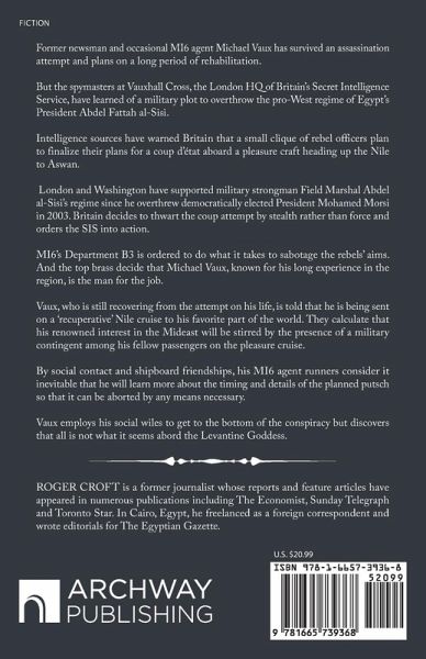Former newsman and occasional MI6 agent Michael Vaux has survived an assassination attempt and plans on a long period of rehabilitation. But the spymasters at Vauxhall Cross, the London HQ of Britain's Secret Intelligence Service, have learned of a military plot to overthrow the pro-West regime of Egypt's President Abdel Fattah al-Sisi. Intelligence sources have warned Britain that a small clique of rebel officers plan to finalize their plans for a coup d'état aboard a pleasure craft heading up the Nile to Aswan. London and Washington have supported military strongman Field Marshal Abdel al-Sisi's regime since he overthrew democratically elected President Mohamed Morsi in 2003. Britain decides to thwart the coup attempt by stealth rather than force and orders the SIS into action. MI6's Department B3 is ordered to do what it takes to sabotage the rebels' aims. And the top brass decide that Michael Vaux, known for his long experience in the region, is the man for the job. Vaux, who is still recovering from the attempt on his life, is told that he is being sent on a 'recuperative' Nile cruise to his favorite part of the world. They calculate that his renowned interest in the Mideast will be stirred by the presence of a military contingent among his fellow passengers on the pleasure cruise. By social contact and shipboard friendships, his MI6 agent runners consider it inevitable that he will learn more about the timing and details of the planned putsch so that it can be aborted by any means necessary. Vaux employs his social wiles to get to the bottom of the conspiracy but discovers that all is not what it seems abord the Levantine Goddess.