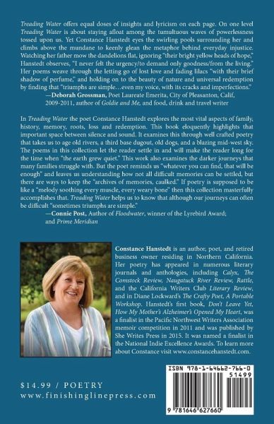 Through well-crafted verse, and in a voice that is both lyrical and insightful, Treading Water explores memory, roots, family, and life's struggles. The poet invites the reader in to experience emotions that are universal. While reflecting on the dualities of loss and redemption, and suffering and acceptance, the author holds on to the beauty of nature and the possibilites of hope. And although journeys can be difficult, "sometimes triumphs are simple . . . even my voice, with its cracks and imperfections."