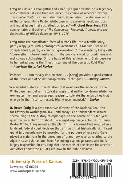 Whittaker Chambers and Elizabeth Bentley shocked America in 1948 with their allegations that Communist spies had penetrated the American government. The resulting perjury trial of Alger Hiss is already legendary, but Chambers and Bentley also named Harry Dexter White, a high-ranking Treasury official. (Hiss himself thought that White had been the real target of the House Un-American Activities Committee.) When White died only a week after his bold defense before Congress, much speculation remained about the cause of his death and the truth of the charges made against him. Armed with a wealth of new information, Bruce Craig examines this controversial case and explores the "ambiguities" that have haunted it for more than half a century. The highest ranking figure in the Roosevelt and Truman administrations to be accused of espionage, White played a central role in the founding of the United Nations' twin financial institutions, the World Bank and International Monetary Fund. For years after his death, White was a target of red-baiting by FBI director J. Edgar Hoover and Eisenhower's attorney general Herbert Brownell. Two Republican-controlled Senate committees even held White accountable for formulating the "pro-Russian" Morgenthau Plan for post-war Germany and for orchestrating the loss of mainland China to the Communists. Craig draws heavily on previously untapped or underused sources, including White's personal papers, Treasury Department records, FBI files, and the once secret Venona files of decrypted Soviet espionage cables. Interviews with nearly two dozen key figures in the case, including Alger Hiss and former KGB officer V. G. Pavlov, also help bring White's story to life. Sifting through this mountain of evidence, Craig retraces White's rise to power within the Treasury Department and confirms that White was involved in a "species of espionage"--but also shows that the same evidence contradicts Bentley's charges of "policy subversion." What emerges is an evenhanded portrait of neither a monster nor a martyr but rather a committed New Dealer and internationalist whose hopes for world peace transcended national loyalties--a man who saw some benefit in cooperating with the Soviets but had no affection for dictatorship. Although it still remains unclear whether White leaked classified information vital to national security, Craig clearly shows that none of the most serious allegations against him can be substantiated.