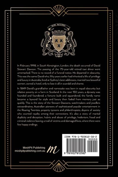 In February 1998, in South Kensington, London the death occurred, unremarked, of 75-year-old retired taxi driver David Stewart Dawson. This was the same David who, fifty years earlier in Australia had inherited a life of privilege and luxury, lived at Sydney's best addresses, married two beautiful women, then lost it all in scandal and shame. In 1849 his grandfather and namesake was born on a farm in Scotland in relative poverty. In the next 150 years, an Australian dynasty was founded and foundered, a fortune built and squandered, the family name became an international byword for style and luxury, only to fade from memory in less than a generation. This is the story of the Stewart Dawsons: watchmakers and jewellers, Australian pioneers of Jazz Age popular culture and entertainment, property tycoons and philanthropists, who counted stars of stage and screen, earls and princes among their connections. It's also a story of marital duplicity and deception, hubris and abuse of privilege, hedonism, fraud, and criminal violence leaving a trail of victims and damaged lives, where there were few happy endings.