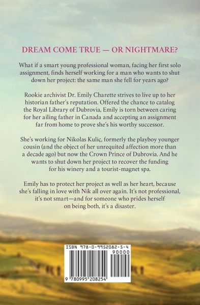 DREAM COME TRUE - OR NIGHTMARE? What if a smart young professional woman, facing her first solo assignment, finds herself working for a man who wants to shut down her project: the same man she fell for years ago? Rookie archivist Dr. Emily Charette strives to live up to her historian father's reputation. Offered the chance to catalog the Royal Library of Dubrovia, Emily is torn between caring for her ailing father in Canada and accepting an assignment far from home to prove she's his worthy successor. She's working for Nikolas Kuliç, formerly the playboy younger cousin (and the object of her unrequited affection more than a decade ago) but now the Crown Prince of Dubrovia. And he wants to shut down her project to recover the funding for his winery and a tourist-magnet spa. Emily has to protect her project as well as her heart-because she's falling in love with Nik all over again. It's not professional, it's not smart-and for someone who prides herself on being both, it's a disaster.