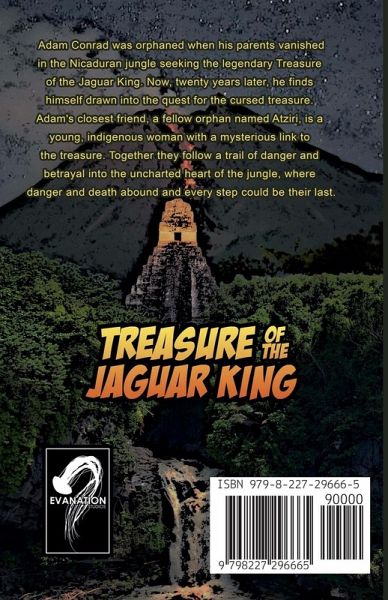 Adam Conrad was orphaned when his parents vanished in the Nicaduran jungle seeking the legendary Treasure of the Jaguar King. Now, twenty years later, he finds himself drawn into the quest for the cursed treasure. Adam's closest friend, a fellow orphan named Atziri, is a young, indigenous woman with a mysterious link to the treasure. Together they follow a trail of danger and betrayal into the uncharted heart of the jungle where danger and death abound and every step could be their last.