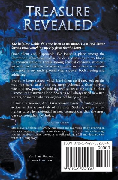 The helpless Noble I was once is no more. I am Red Sister Sirana, watching my city from the shadows. Once silent and disposable, I've found my place among the Sisterhood of Sivaraus, coarse, crude, and stirring to my blood. In crimson uniform I walk among sensual consorts, studious wizards, and sadistic Priestesses. I am an initiate with true influence in my underground city, a power both freeing and addicting. Everyone keeps secrets which bind them up if they jerk the web too much, and none are more vulnerable than novices wielding new power. Should my own secret come to the surface, I know I can't survive alone. Sivaraus will always need new Red Sisters, no matter what strangeness we bring with us. In Treasure Revealed, A.S. Etaski weaves threads of intrigue and action in this second tale of the Sister Seekers. Sister Seekers is dark epic fantasy for adults with an ever-broadening scope. The saga genre-hops a bit so things never get stale. Found Family is a core theme throughout. Perfect for fans of entwined plots, challenging themes, immersive worldbuilding, and elements of erotic horror. Sexuality and inner conflict play into character growth with nuanced intrigue, intense action, and fantastical magic. The series begins underground with an isolated race of Dark Elves whose intricate webs first ensnare then catapult us to places a Red Sister can only imagine in her dreams.