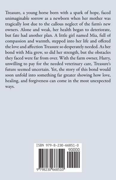 Treasure, a young horse born with a spark of hope, faced unimaginable sorrow as a newborn when her mother was tragically lost due to the callous neglect of the farm's new owners. Alone and weak, her health began to deteriorate, but fate had another plan. A little girl named Mia, full of compassion and warmth, stepped into her life and offered the love and affection Treasure so desperately needed. As her bond with Mia grew, so did her strength, but the obstacles they faced were far from over. With the farm owner, Harry, unwilling to pay for the needed veterinary care, Treasure's future seemed uncertain. Yet, the story of this bond would soon unfold into something far greater showing how love, healing, and forgiveness can come in the most unexpected ways.