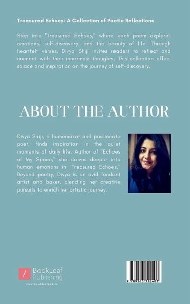 Dive into the profound world of ""Treasured Echoes,"" the second poetry collection by Divya Shiji, inviting readers on a transformative journey of emotional depth and introspection. This anthology features heartfelt poems, each meticulously crafted to resonate with the innermost emotions of the reader. Accompanied by poignant quotes and personal reflections, these verses illuminate the beauty and complexity of life's moments. A Journey of Self-Discovery and Reflection Many of the poems in ""Treasured Echoes"" originated from my website, My Space: A Journey Towards Self-Discovery. This platform has been my sanctuary, where I first began to explore and express my innermost thoughts. Now, for the second time, I gather these verses to share with you in the form of my second poetry book, ""Treasured Echoes."" Each poem in this collection serves as a mirror, offering glimpses into the labyrinth of self-discovery and the gentle embrace of self-love. From moments of quiet solitude to the crescendo of resilience, ""Treasured Echoes"" is a testament to the human spirit's capacity for growth, healing, and transformation. Guiding Stars of Wisdom Accompanying these verses are carefully curated quotes, akin to guiding stars in the night sky. They illuminate the path to understanding and enlightenment, serving as companions on this poetic voyage. These quotes echo the sentiments and wisdom found within these pages, enriching the reader's journey of exploration and introspection. Inspiration and Reflection Explore themes of love, resilience, and self-discovery through Divya's evocative verses, each crafted with lyrical beauty and emotional depth. ""Treasured Echoes"" captures the whispers of the heart and echoes the timeless emotions that bind us together, inviting readers to pause, reflect, and connect with their own inner landscapes. Embrace Your Journey May these words resonate deeply within you, stirring the echoes of your thoughts and emotions. May they inspire you to embrace your own journey of self-discovery, finding solace and strength in the beauty of introspection. Welcome to ""Treasured Echoes,"" where every poem is a melody, and every page is a sanctuary for the soul. Immerse yourself in this poetic journey and discover the enduring power of poetry to capture the essence of human experience.