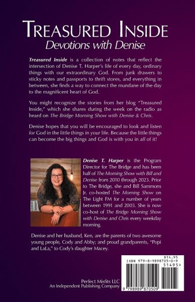 Treasured Inside is a collection of notes that reflect the intersection of Denise Harper's life of every day, ordinary things with our extraordinary God. From junk drawers to sticky notes and passports to thrift stores, and everything in between, she finds a way to connect the mundane of the day to the magnificent heart of God.You might recognize the stories from her blog "Treasured Inside," which she shares during the week on the radio as heard on The Bridge Morning Show with Denise & Chris.Denise hopes that you will be encouraged to look and listen for God in the little things in your life. Because the little things can become the big things and God is with you in all of it!