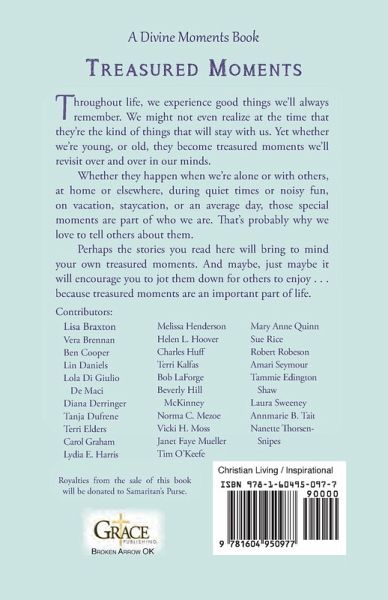 Throughout life, we experience good things we'll always remember. We might not even realize at the time that they're the kind of things that will stay with us. Yet whether we're young, or old, they become treasured moments we'll revisit over and over in our minds. Whether they happen when we're alone or with others, at home or elsewhere, during quiet times or noisy fun, on vacation, staycation, or an average day, those special moments are part of who we are. That's probably why we love to tell others about them. Perhaps the stories you read here will bring to mind your own treasured moments. And maybe, just maybe it will encourage you to jot them down for others to enjoy . . . because treasured moments are an important part of life. Contributors: Lisa Braxton, Vera Brennan, Ben Cooper, Lin Daniels, Lola Di Giulio De Maci, Diana Derringer, Tanja Dufrene, Terri Elders, Carol Graham, Lydia E. Harris, Melissa Henderson, Helen L. Hoover, Charles Huff, Terri Kalfas, Bob LaForge, Beverly Hill McKinney, Norma C. Mezoe, Vicki H. Moss, Janet Faye Mueller, Tim O'Keefe, Mary Anne Quinn, Sue Rice, Robert Robeson, Amari Seymour, Tammie Edington Shaw, Laura Sweeney, Annmarie B. Tait, Nanette Thorsen-Snipes