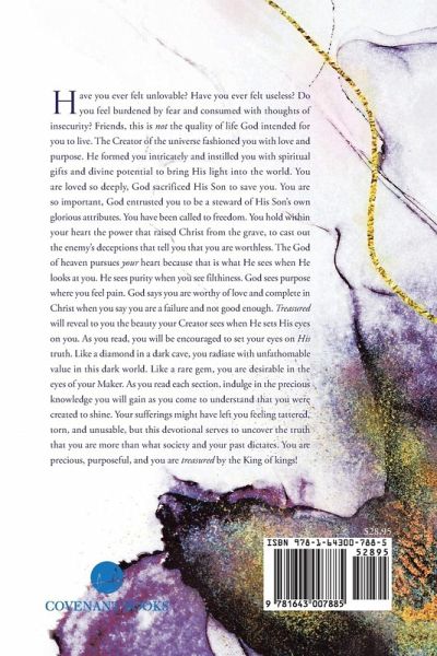 Have you ever felt unlovable? Have you ever felt useless? Do you feel burdened by fear and consumed with thoughts of insecurity? Friends, this is not the quality of life God intended for you to live. The Creator of the universe fashioned you with love and purpose. He formed you out of nothingness and instilled you with spiritual gifts and divine potential to bring His light into the world. You are loved so deeply, God sacrificed His Son to save you. You are so important, God entrusted you to be a steward of His Son's own glorious attributes. You have been called to freedom. You hold within your heart the power that raised Christ from the grave, to cast out the enemy's deceptions that tell you that you are worthless. The God of heaven pursues your heart because that is what He sees when He looks at you. He sees purity when you see filthiness. God sees purpose where you feel pain. God says you are worthy of love and complete in Christ when you say you are a failure and not good enough. Treasured will reveal to you the beauty your Creator sees when He sets His eyes on you. As you read, you will be encouraged to set your eyes on His truth. Like a diamond in a dark cave, you radiate with unfathomable value in this dark world. Like a rare gem, you are desirable in the eyes of your Maker. As you read each section, indulge in the precious knowledge you will gain as you come to understand that you were created to shine. Your sufferings might have left you feeling tattered, torn, and unusable, but this devotional serves to uncover the truth that you are more than what society and your past dictates. You are precious, purposeful, and you are treasured!