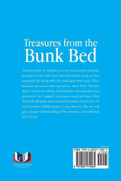 Treasures from the Bunkbed is a ten-year journey into the thoughts of two little boys who had plenty to say as they navigated life along with the challenges they faced. Their innocent questions and expressions, taken from "Neena's diary," at times are off-the-wall, hilarious, and sometimes just plain sweet. As I "unpack" my treasure trunk, my hope is that this book will spark some treasured memories of your own. As you hear their childlike prayers, I pray that you, like me, will gain a deeper understanding of the awesome, unconditional love of God.