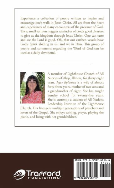 Experience a collection of poetry written to inspire and encourage one's walk in Jesus Christ. All are from the heart and experiences of many encounters of the presence of God. These small sermon nuggets remind us of God's good pleasure to give us the kingdom through Jesus Christ. One can taste and see the Lord is good. Oh, that our earthen vessels have God's Spirit abiding in us, and we in Him. This group of poetry and comments regarding the Word of God can be used as a daily devotional.