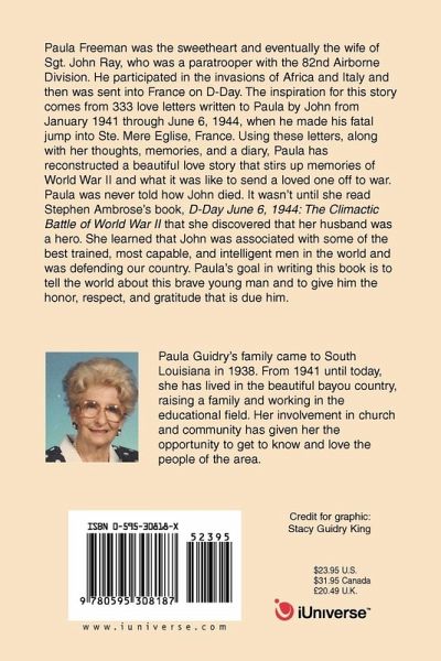 Paula Freeman was the sweetheart and eventually the wife of Sgt. John Ray, who was a paratrooper with the 82nd Airborne Division. He participated in the invasions of Africa and Italy and then was sent into France on D-Day. The inspiration for this story comes from 333 love letters written to Paula by John from January 1941 through June 6, 1944, when he made his fatal jump into Ste. Mere Eglise, France. Using these letters, along with her thoughts, memories, and a diary, Paula has reconstructed a beautiful love story that stirs up memories of World War II and what it was like to send a loved one off to war. Paula was never told how John died. It wasn't until she read Stephen Ambrose's book, D-Day June 6, 1944: The Climactic Battle of World War II that she discovered that her husband was a hero. She learned that John was associated with some of the best trained, most capable, and intelligent men in the world and was defending our country. Paula's goal in writing this book is to tell the world about this brave young man and to give him the honor, respect, and gratitude that is due him.