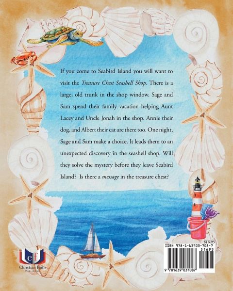 If you come to Seabird Island you will want to visit the Treasure Chest Seashell Shop. There is a large, old trunk in the shop window. Sage and Sam spend their family vacation helping Aunt Lacey and Uncle Jonah in the shop. Annie their dog, and Albert their cat are there too. One night, Sage and Sam make a choice. It leads them to an unexpected discovery in the seashell shop. Will they solve the mystery before they leave Seabird Island? Is there a message in the treasure chest?