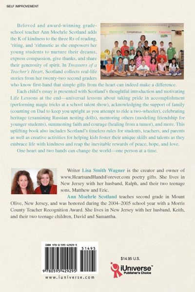Beloved and award-winning grade-school teacher Ann Moehrle Scotland adds the K of kindness to the three Rs of reading, 'riting, and 'rithmetic as she empowers her young students to nurture their dreams, express compassion, give thanks, and share their generosity of spirit. In Treasures of a Teacher's Heart, Scotland collects real-life stories from her twenty-two second graders who know first-hand that simple gifts from the heart can indeed make a difference. Each child's essay is presented with Scotland's thoughtful introduction and motivating Life Lessons at the end-universal lessons about taking pride in accomplishment (performing magic tricks at a school talent show), acknowledging the support of family (counting on Dad to keep you upright as you attempt to ride a two-wheeler), celebrating heritage (examining Russian nesting dolls), mentoring others (modeling friendship for younger students), summoning faith and courage (healing from a tumor), and more. This uplifting book also includes Scotland's timeless rules for students, teachers, and parents as well as creative activities for helping kids foster their unique skills and talents as they embrace life with kindness and reap the inevitable rewards of peace, hope, and love. One heart and two hands can change the world-one person at a time.
