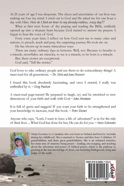 At 21 years of age I was desperate. The chaos and uncertainty of our lives was making me lose my mind. I cried out to God and He asked me for one hour a day with Him. How do I find an hour in my already endless, crazy day What at first were hours of dry praying and reading the Bible, suddenly opened up into a treasure hunt because God started to answer my prayers. I began to hear the voice of God. Forty some years later, I reflect on how God sent me to many cities and nations, to preach, teach and pray, the surprising journey He took me on. He has shown up in many miraculous ways. There are many ordinary days in between. Well, not. Because to breathe is a miracle, snowflakes are miracles, to see is a miracle, to be born is a miracle. But, these stories are exceptional. God said, "Tell the stories." God loves to take ordinary people and use them to do extraordinary things! A must read for all generations. Dr. Dick and Joan Deweert I found this book absolutely fascinating, and once I started, I really was enthralled by it. Greg Paulson A must-read page-turner! Be prepared to laugh, cry and be stretched to new dimensions of your faith and walk with God John Abraham It is full of gems and nuggets! If you want your faith to be strengthened and your knowledge to increase, read this book. Peter Ziemer Anyone who says, "Lord, I want to have a life of adventure!" is in for the ride of their lives ... What God has done for her, He can do for you. Steve Schroeder