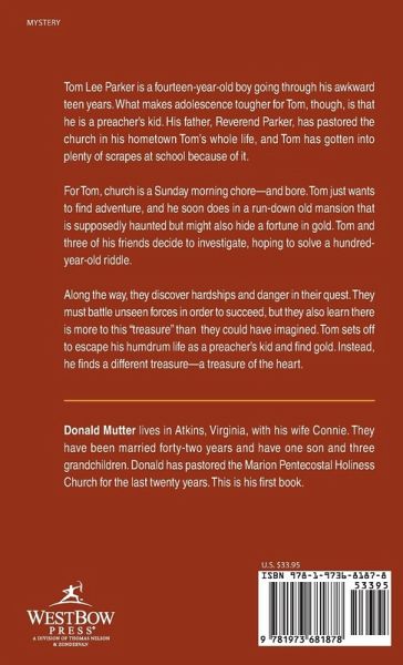 Tom Lee Parker is a fourteen-year-old boy going through his awkward teen years. What makes adolescence tougher for Tom, though, is that he is a preacher's kid. His father, Reverend Parker, has pastored the church in his hometown Tom's whole life, and Tom has gotten into plenty of scrapes at school because of it. For Tom, church is a Sunday morning chore-and bore. Tom just wants to find adventure, and he soon does in a run-down old mansion that is supposedly haunted but might also hide a fortune in gold. Tom and three of his friends decide to investigate, hoping to solve a hundred-year-old riddle. Along the way, they discover hardships and danger in their quest. They must battle unseen forces in order to succeed, but they also learn there is more to this "treasure" than they could have imagined. Tom sets off to escape his humdrum life as a preacher's kid and find gold. Instead, he finds a different treasure-a treasure of the heart.