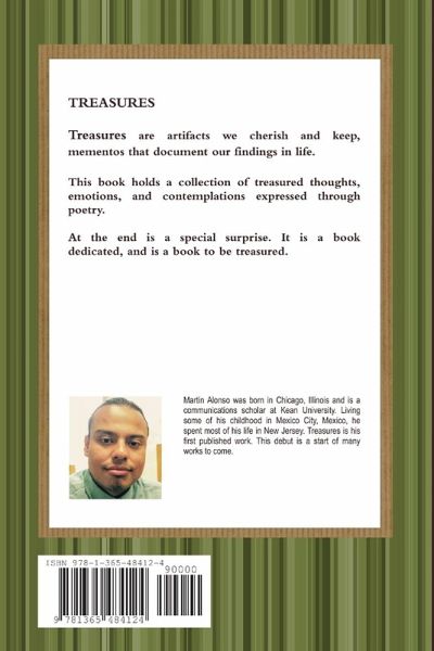 Treasures are artifacts we cherish and keep, mementos that document our findings in life. Martin Alonso debuts as a published poet in Treasures. Treasures is a collection of poems and the book is dedicated to his future wife. At the end is the proposal.