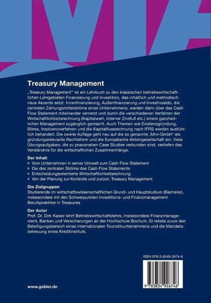 'Treasury Management ist ein Lehrbuch zu den klassischen betriebswirtschaftlichen Lehrgebieten Finanzierung und Investition, das inhaltlich und methodisch neue Akzente setzt. Innenfinanzierung, Außenfinanzierung und Investivsaldo, die zentralen Zahlungsmittelströme eines Unternehmens, werden darin über das Cash Flow Statement miteinander vernetzt und durch die verschiedenen Verfahren der Wirtschaftlichkeitsrechnung (Kapitalwert, interner Zinsfuß etc.) einem ganzheitlichen Management zugänglich gemacht. Auch Themen wie Existenzgründung, Börse, Insolvenzverfahren und die Kapitalflussrechnung nach IFRS werden ausführlich behandelt. Die zweite Auflage geht neu auf die so genannte 'Mini-GmbH' als gründungsrelevante Rechtsform und die Europäische Aktiengesellschaft ein. Viele Übungsaufgaben, die zu praxisnahen Case Studies verbunden sind, vertiefen das Verständnis für die wirtschaftlichen Zusammenhänge.