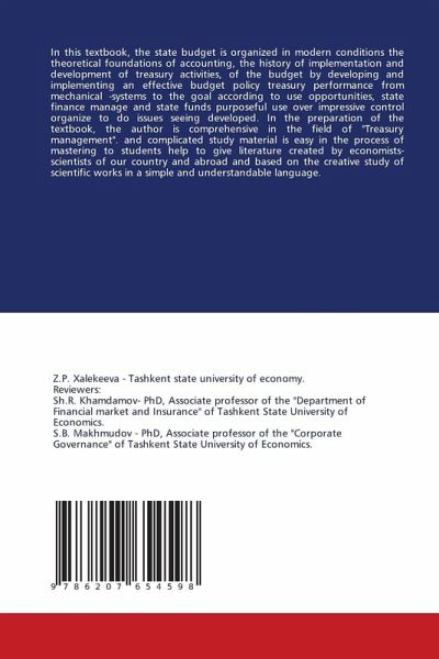 In this textbook, the state budget is organized in modern conditions the theoretical foundations of accounting, the history of implementation and development of treasury activities, of the budget by developing and implementing an effective budget policy treasury performance from mechanical -systems to the goal according to use opportunities, state finance manage and state funds purposeful use over impressive control organize to do issues seeing developed. In the preparation of the textbook, the author is comprehensive in the field of "Treasury management". and complicated study material is easy in the process of mastering to students help to give literature created by economists-scientists of our country and abroad and based on the creative study of scientific works in a simple and understandable language.