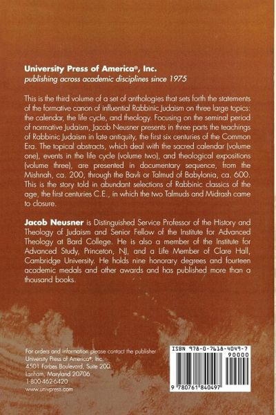 This is the third volume of a set of anthologies that sets forth the statements of the formative canon of influential Rabbinic Judaism on three large topics: the calendar, the life cycle, and theology. Focusing on the seminal period of normative Judaism, the editor Jacob Neusner presents in three parts the teachings of Rabbinic Judaism in late antiquity, the first six centuries of the Common Era.